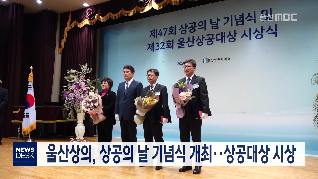 울산상공회의소는 오늘(4/1) 제47회 상공의 날 기념식을 열고 유공자를 표창했습니다. 울산상공대상에는 케이티티플랜트 신명숙 회장이 경영대상을, 현대미포조선 민덕기 상무가 기술대상을, 한국바스프 유선정 공장장이 안전대상을 받았습니다. 또 전국 상공의 날 유공자로는 SK에너지 박경환 총괄부사장이 동탑산업훈장을...