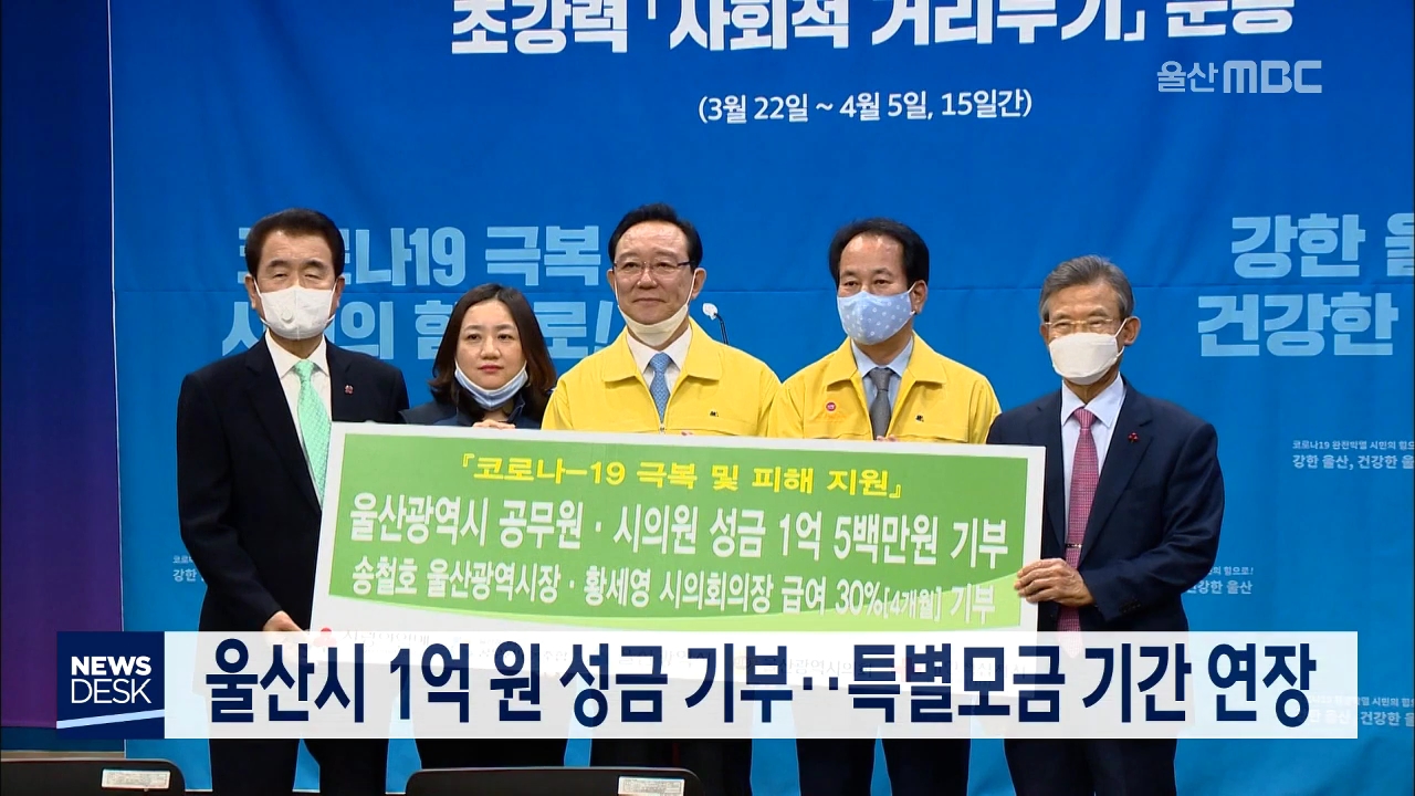 코로나19 극복과 피해 지원을 위한 성금 전달식이 오늘(4/1) 시청에서 열렸습니다. 송철호 울산시장과 황세영 시의회 의장은 4개월 동안 급여의 30%를, 시 의원과 공무원 등 3천1백여 명은 1억 5백만 원의 성금을 모아 전달했습니다. 울산시 체육회도 성금 1천만원을 전달하는 등 시 산하기관과 공공기관 등으로 모금 분위...