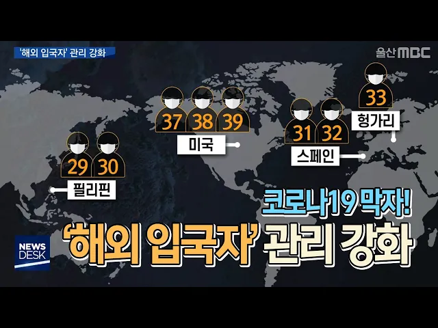 ◀ANC▶최근 울산지역 코로나19 추가 확진환자는 모두해외에서 입국한 사람들입니다.이 때문에 울산시는 해외 입국자 관리 강화를위해 인천공항에서부터 특별수송버스를 운행하고 자가격리를 의무화하기로 했습니다.김문희 기자. ◀END▶ ◀VCR▶CG)지난 26일 발생한 울산지역 38번째와 39번째 확진환자는 미국 뉴욕에...