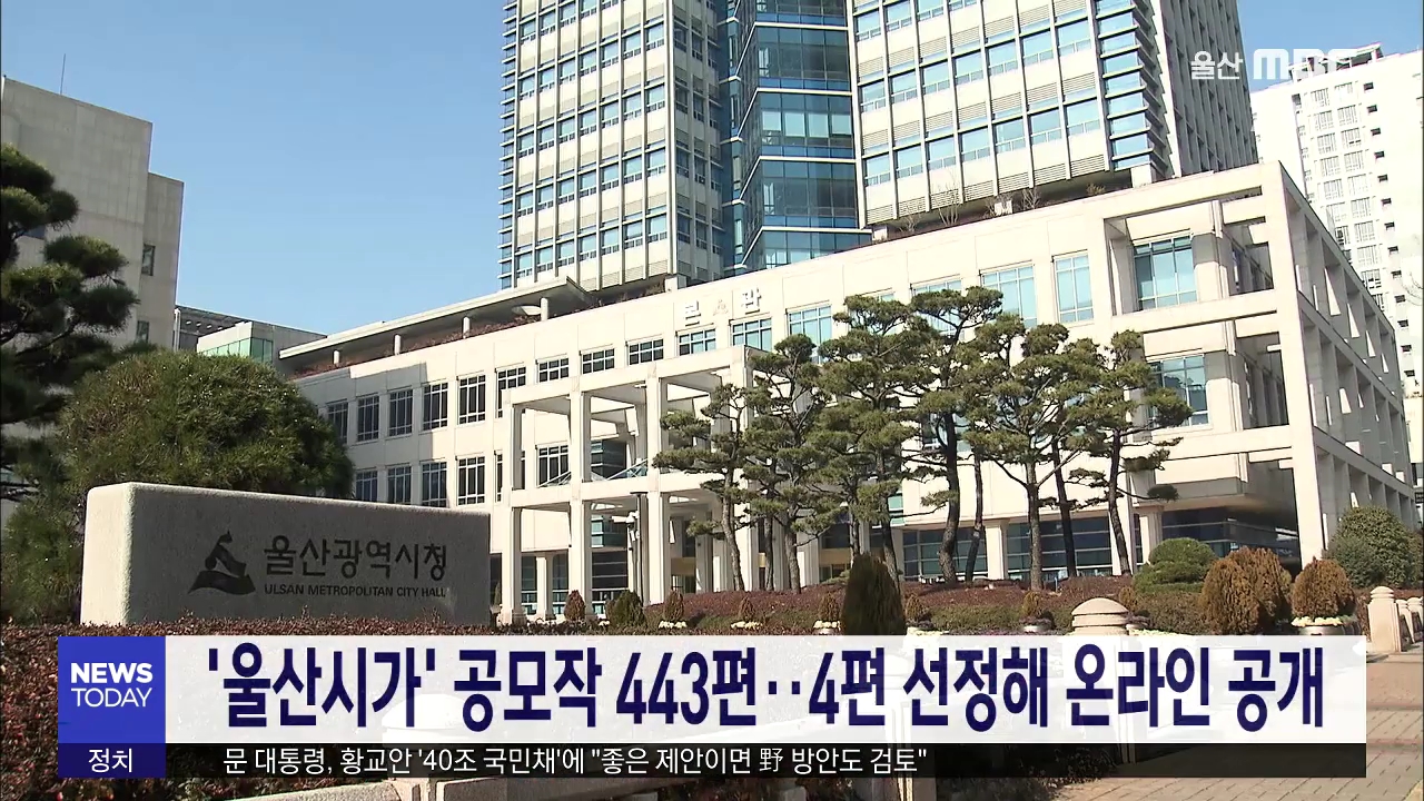 울산시가 표절 의혹이 제기된 '울산시가' 가사를 전국 공모한 결과 443편의 응모작이 접수돼 심의를 벌이고 있습니다. 시는 응모작에 대해 다음달 초까지 심의를 벌여 우수작품 4편을 선정한 뒤 온라인상에 공개해 선호도 조사를 거칠 계획입니다. 그동안 20년 넘게 불리던 '울산시가' 가사가 '대구 중구의 노래'와 상당 부...
