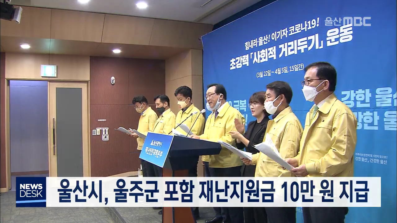 울산시는 울주군을 제외하지 않고 각 구·군에 모두 재난지원금을 지원하겠다고 밝혔습니다. 시는 이에 따라 정부 지원을 받지 않는 중위 소득 100% 이하 가정에 1인당 10만 원씩, 대략 33만명 정도에게 재난지원금을 지급할 계획입니다. 시는 지원금을 울산페이나 지역은행 체크카드로 지급해서 지급일로부터 6개월 이내 울...