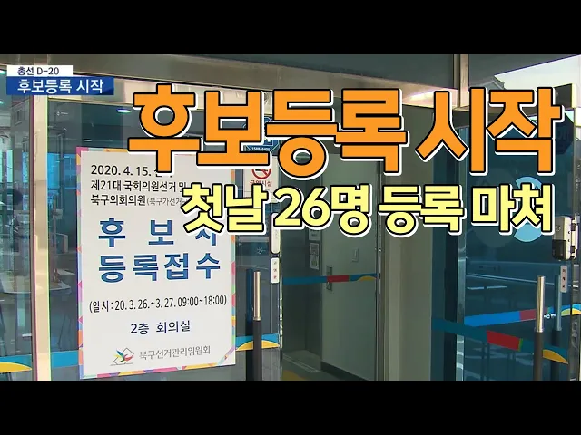 ◀ANC▶4.15 총선 후보 등록 첫날 26명의 예비후보가 후보 등록을 마쳤습니다.코로나19로 어수선한 분위기지만, 각 정당은다음달 2일부터 시작되는 선거운동 전에 승기를 잡겠다는 각오를 다졌습니다.최지호 기자. ◀END▶ ◀VCR▶오전9시, 각 구·군 선관위가 업무를 시작하자마자 예비후보들의 발길이이어집니다.빠진 ...