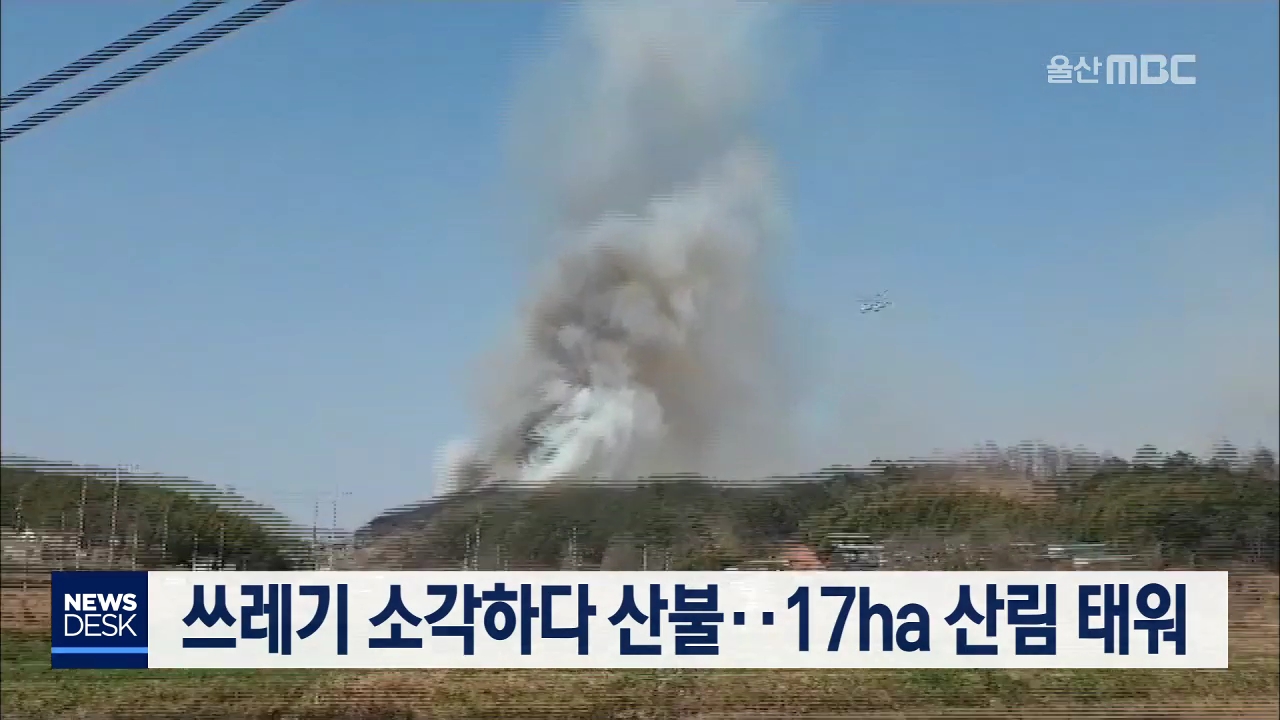 어제(3/23) 오후 발생한 울주군 두서면 산불은 쓰레기 소각이 원인인 것으로 밝혀졌습니다. 울주군 산림사법경찰은 불을 낸 58살 전모 씨를 산림보호법 위반 혐의로 입건해 조사할 계획입니다. 한편 어제 산불은 강한 바람을 타고 인근 마을 야산으로까지 번지면서 모두 17ha의 산림을 태우고 5시간여 만에 꺼졌습니다.//