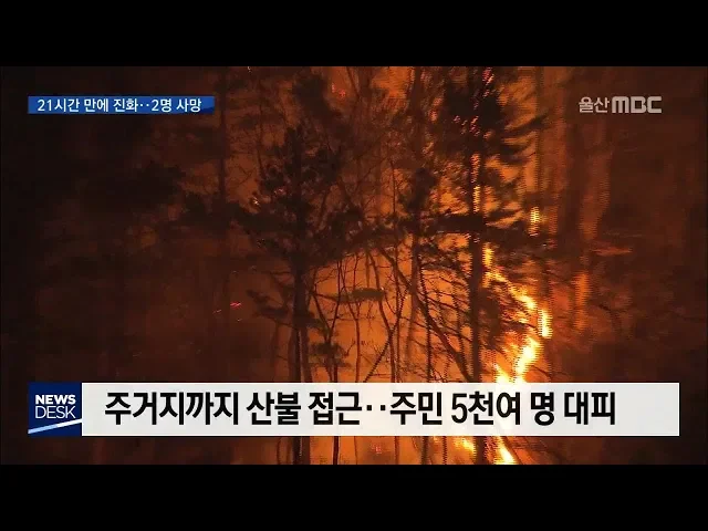 ◀ANC▶어젯밤 산불은 7번 국도와 인근 주유소, 병원,아파트 단지 인근으로 까지 번져주민 5천여 명이 대피했습니다. 경찰과 소방당국은 방화선을 구축하느라 밤샘 진화작업을 벌였습니다.긴박했던 상황을 정인곤 기자가 보도합니다. ◀END▶ ◀VCR▶산등성이를 따라 불이 활활 타오릅니다.강한 바람을 타고 불꽃은 야...