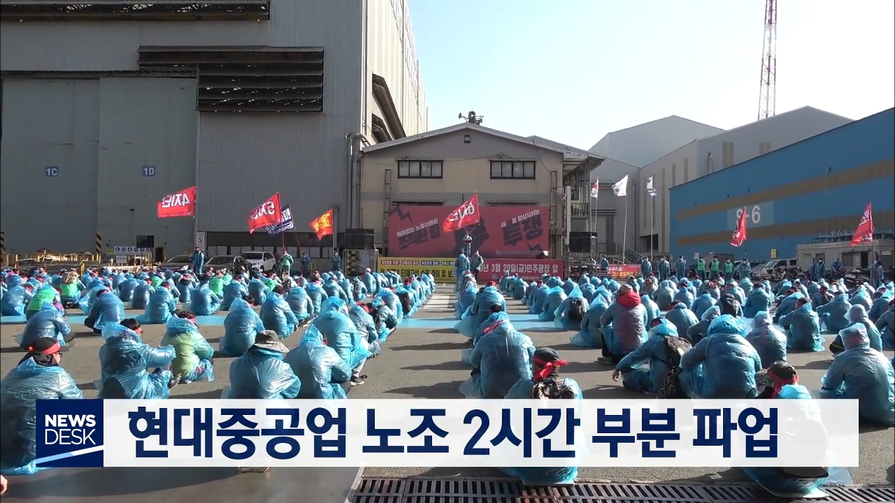 현대중공업 노조는 오늘(3/20) 오후 3시 반부터 2시간 동안 부분 파업을 벌였습니다 . 노조는 교섭을 시작한 후 11개월이 지나도록 회사가 임금 안을 제시하지 않았다며 사측에 성실한 교섭과 조속한 타결을 촉구했습니다. 한편, 노조는 코로나19 감염 우려를 고려해 집회 참가자들 모두 마스크를 쓰고 1m 거리를 뒀다고 덧...