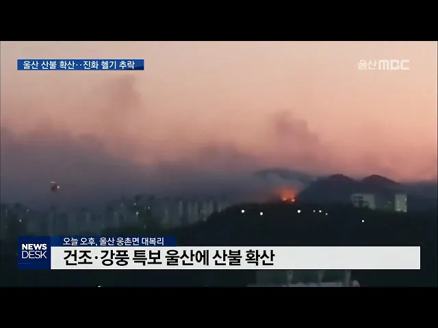 오늘 오후 울주군 웅촌면 대복리 야산에서 발생한 산불이 강한 바람을 타고 번지고 있습니다. 인근 주민 4천명이 대피했습니다. 산불 진화에 나섰던 소방헬기가 추락했습니다. 기장은 구조됐지만 부기장은 실종돼 수색작업을 계속하고 있습니다. 해외에서 코로나19가 유입되는 것을 차단하기 위해 울산시가 해외에 다녀온 ...