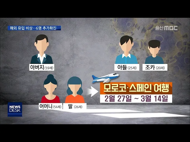 ◀ANC▶울산에서 일가족 5명이 무더기로 코로나19 확진환자로 판명됐습니다. 어머니와 딸이 유럽 여행을 다녀온 후 가족간 전염이 이뤄진 것으로 추정됩니다. 유럽 대회에 참가한 울산 출신의 펜싱 국가대표도 확진판정을 받는 등 울산시가 코로나19 확산 차단에 비상이 걸렸습니다. 유영재 기자 ◀END▶ ◀VCR▶중구에...