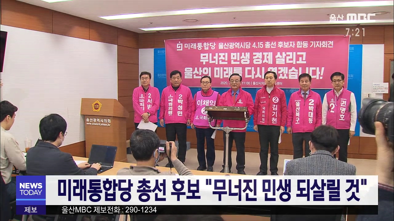 미래통합당 4.15 총선 후보 6명은 오늘(3/18) 울산시의회 프레스센터에서 기자회견을 열고 집권 여당을 견제하는 거대 야당의 참일꾼이 되겠다고 다짐했습니다. 통합당은 장기 불황에 빠진 울산과 나라 전체 경제를 되살리가 위해서는 보수 통합 세력에 힘이 실려야 한다며, 그동안 변함없는 지지를 보내준 시민에게 다시 ...