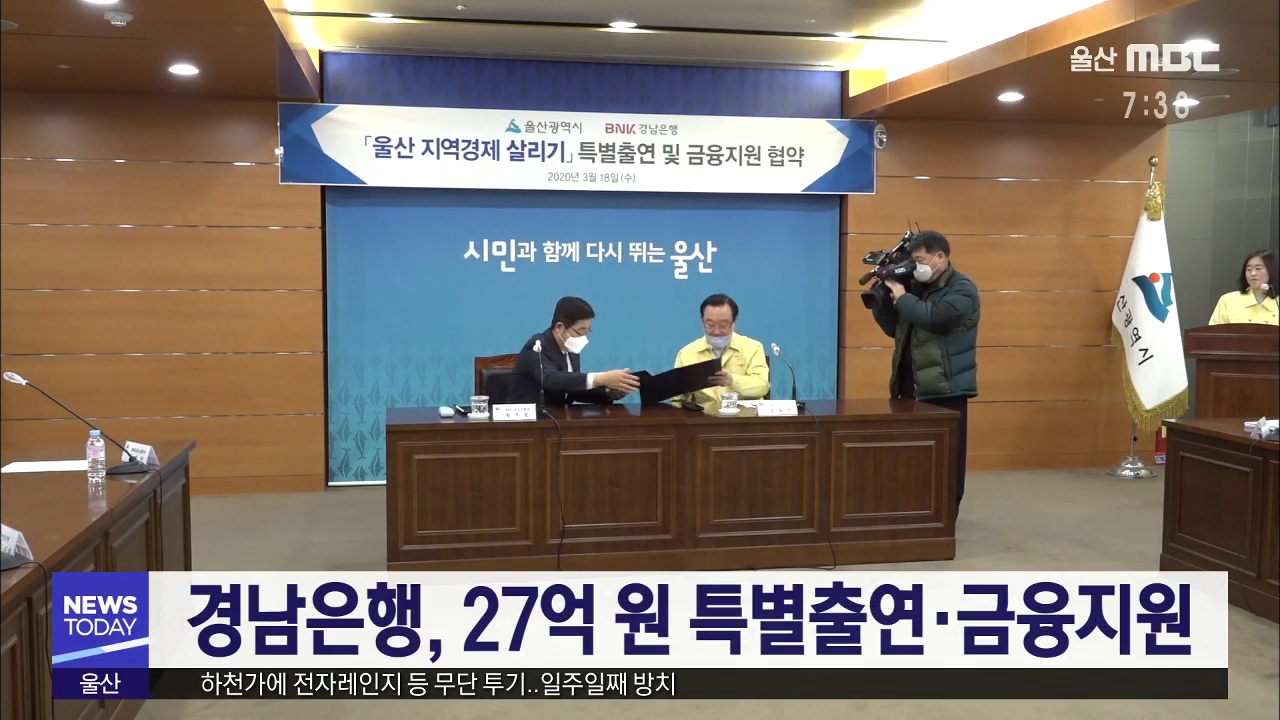 울산시와 BNK경남은행은 오늘(3/18) 시청에서 특별 출연과 금융 지원 업무협약을 체결했습니다. 경남은행은 코로나19 사태로 직·간접적인 피해를 본 소기업과 소상공인을 위해 27억원을 특별 출연하기로 했습니다. 이를 재원으로 지역 소기업과 소상공인에게 400억 원 규모의 특별 금융을 지원합니다. //