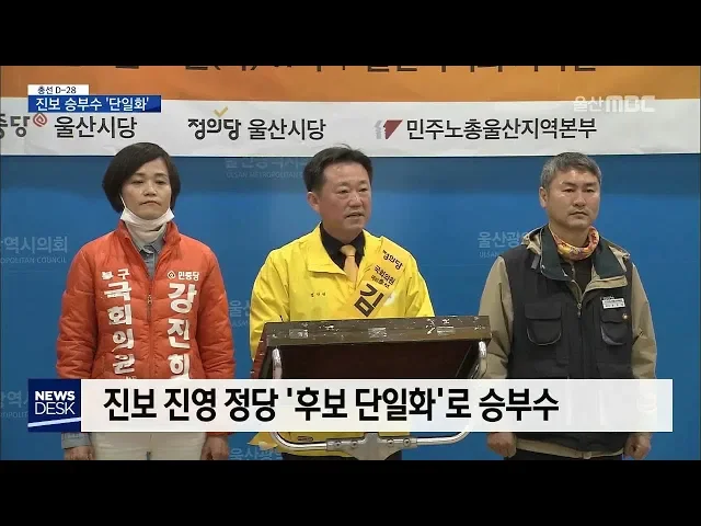 ◀ANC▶4.15 총선 정당별 대진표가 완성되면서본격전인 선거전의 막이 올랐습니다.진보 진영은 거대 양당 구도를 깨트리기 위한단일화에 착수했는데 선거구마다 이해관계가엇갈려 막판 진통이 예상됩니다.최지호 기자. ◀END▶ ◀VCR▶진보 단일화에 물꼬를 튼 건 북구에 출마한 민중당 강진희 후보입니다.강 후보는 진...