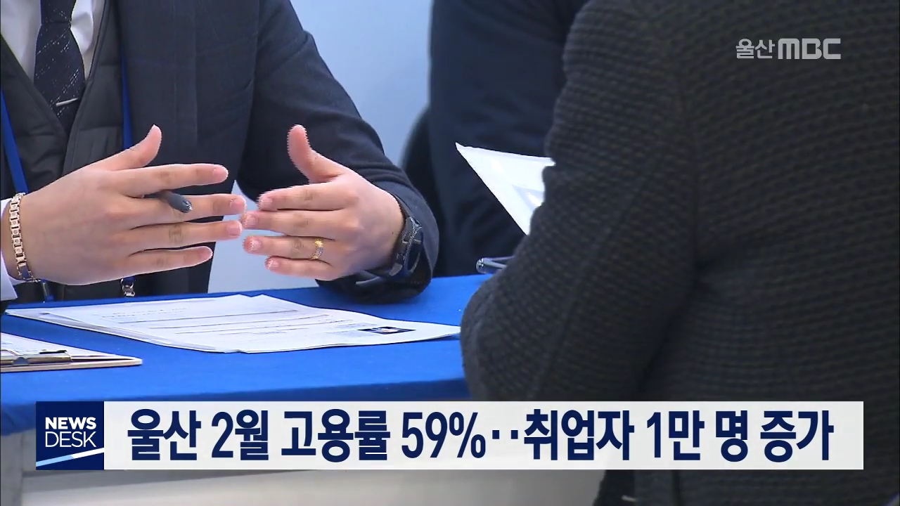 지난달 울산 지역 취업자 수가 1년 전보다 1만 명 늘어나며 고용률도 1.2%p 오른 59%를 기록했습니다. 동남지방통계청의 2월 울산 고용동향을 보면 취업자 수는 56만 9천 명으로 1만 명이 늘어 지난달 1만 4천 명에 이어 2달 연속 1만 명 이상 증가했습니다. 제조업에서는 취업자가 7천 명 줄어든 반면 도소매와 음식숙박, ...