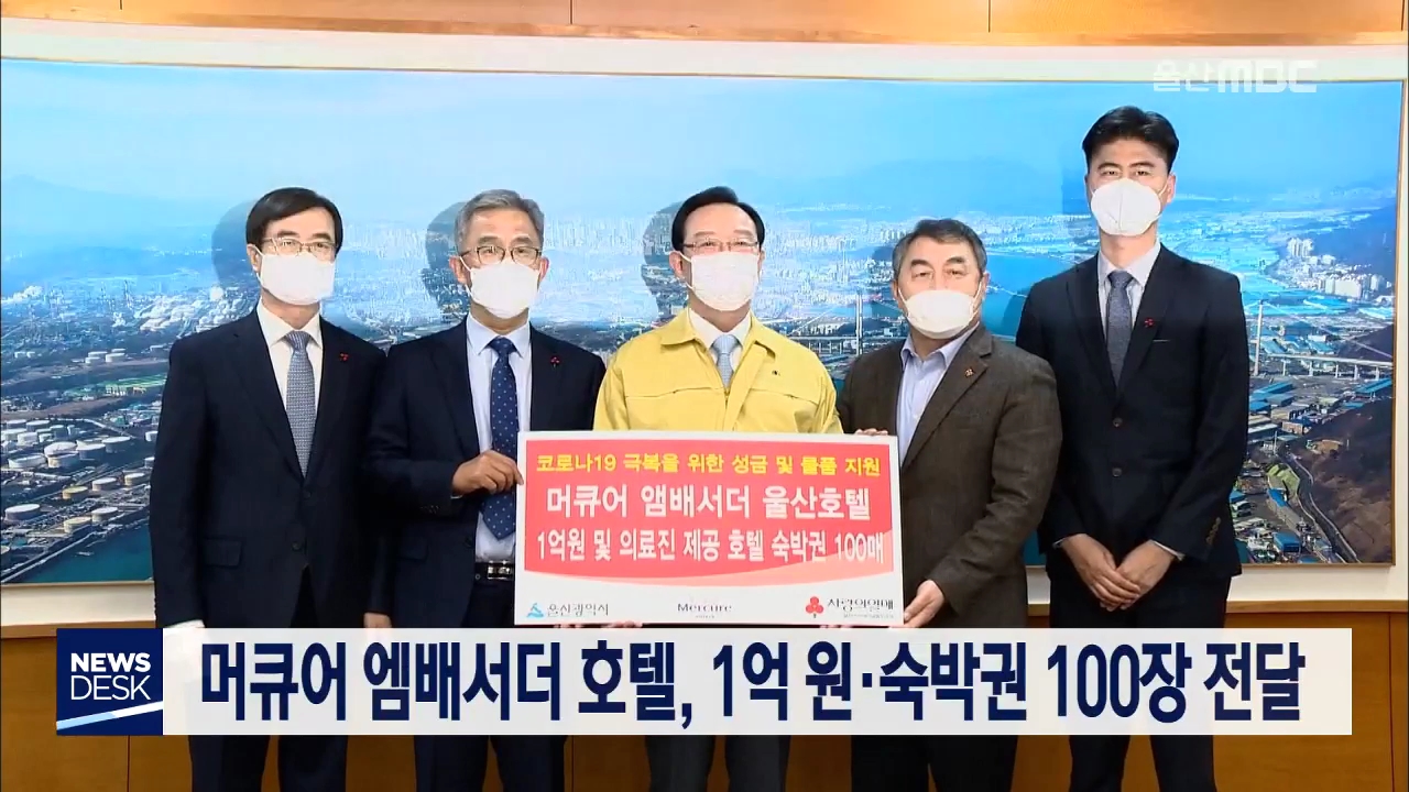 북구 강동의 머큐어 엠배서더 울산호텔이 오늘(3/10) 울산시청을 찾아 마스크 구입을 위한 성금 1억 원과 코로나19 의료진을 격려하기 위한 무료 숙박권 100장을 제공했습니다. 이와함께 한국산업인력공단도 울산시청을 찾아 마스크 구입에 써달라며 1천만 원을 전달했습니다.//