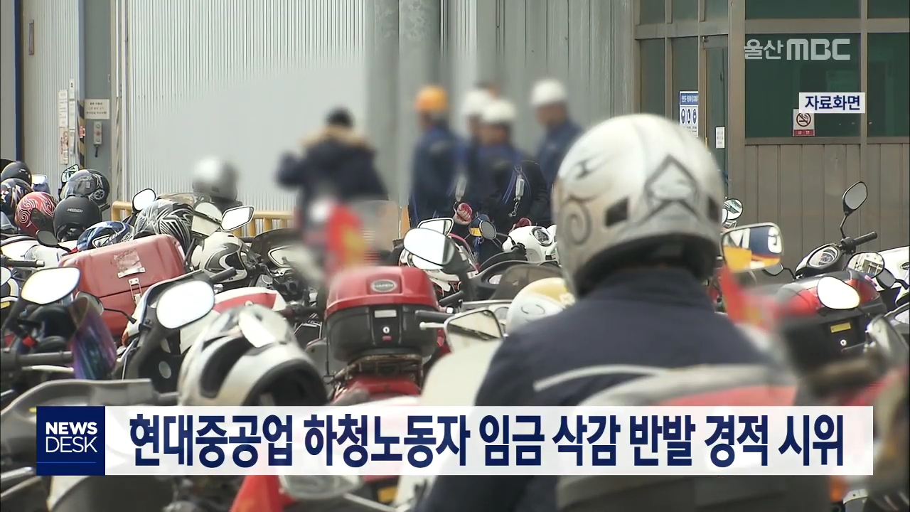 임금 삭감 통보를 받은 현대중공업 하청 노동자들이 오늘(3/10) 오토바이 경적 시위를 벌였습니다. 사내하청업체들은 지난달 말 일당 5천 원을 삭감하고 4대 보험 가입을 책임지지 않겠다고 통보하자 노동자들이 경적 시위에 나선 것으로 전해졌습니다. 노조는 이들이 주로 조선사업부 건조부 소속이며 일당을 지급받는 물...