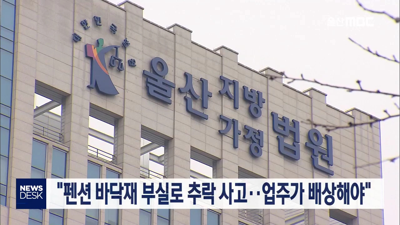 울산지방법원 제12민사부는 A씨가 펜션 업주를 상대로 낸 손해배상 소송에서 업주가 A씨에게 1억 1천 470여만 원을 배상하라고 판결했습니다. A씨는 지난 2018년 4월 경남 양산의 한 펜션 2층에 숙박하던 중 휴대전화를 찾으려고 침대를 치운 뒤 바닥을 밟았다가 바닥재가 무너지면서 3m 아래로 추락해 다치자 소송을 냈습...