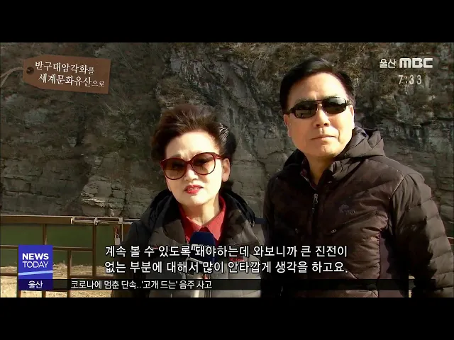 이애경, 이건송 / 남구 신정동 제가 암각화에 15년 전인가 한 번 다녀가고 오랜만에 저희 부부가 오게 됐는데요. 와서 보면서 안타깝다는 생각을 많이 하게 됩니다. 왜냐하면 세계문화유산으로 등재된다는 이야기는 계속 있었지만 아직 거기에 머물러있는 거 같아서 안타깝고. 세계문화유산으로 등재되면서 우리 후손들이 ...
