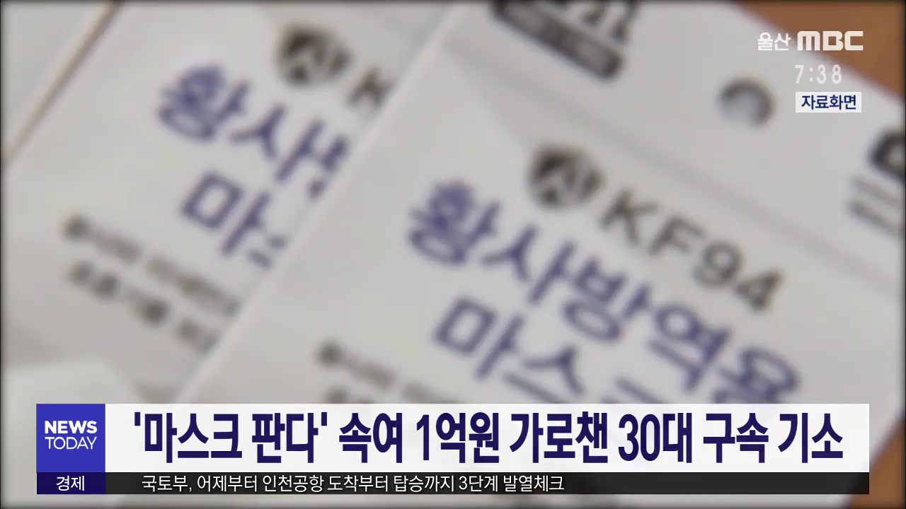 울산지검은 인타넷 중고거래 사이트에서 마스크를 판다고 속여 1억원을 받아 가로챈 혐의로 35살 A씨를 구속 기소했습니다. 검찰에 따르면 A씨는 중고거래 사이트에 KF94 마스크 6만개를 7천만원에 판다는 글을 게시한 뒤 이를 보고 연락한 피해자 8명에게 1억원의 돈만 받아 가로챈 혐의를 받고 있습니다. 검찰은 A씨가 구...