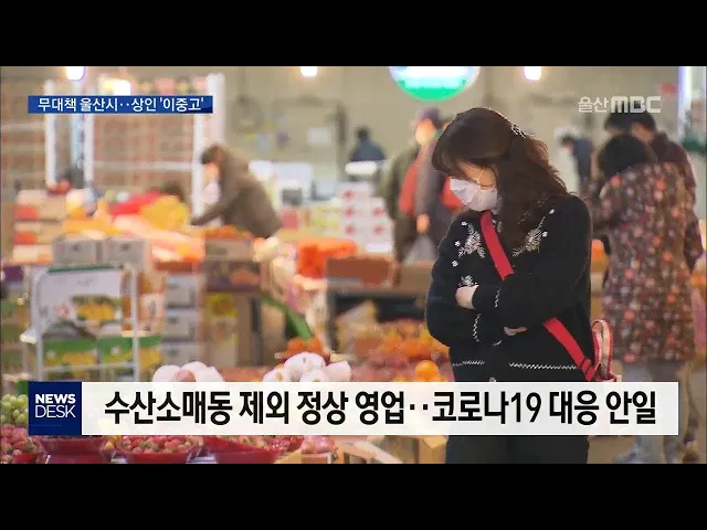 ◀ANC▶코로나 확산 우려로 농수산물시장 수산소매동이2주간 휴업에 들어갔죠.그런데 여기를 제외한 다른 곳은 정상적으로장사를 하고 있는데, 울산시는 그 흔한 방역 조차 제대로 지원하지 않고 있습니다.김문희 기자. ◀END▶ ◀VCR▶남구 삼산동 농수산물도매시장 내 수산소매동은지난 달 26일부터 2주간 임시휴업에...