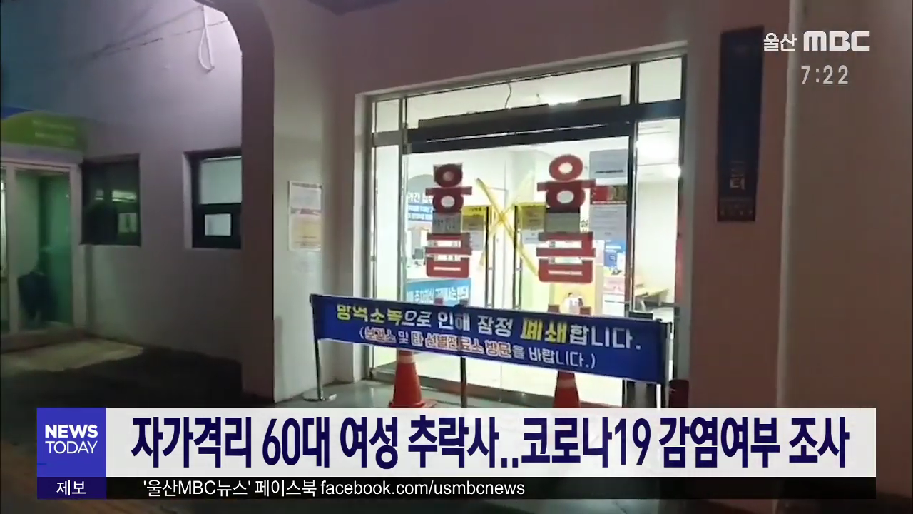어젯 밤(2/26) 10시 30분쯤 울산시 남구 신정동의 한 주택에서 코로나19 의심환자로 분류돼 자가격리 중이던 60대 여성 A씨가 추락해 인근 병원으로 옮겨졌지만 숨졌습니다. 병원 측은 곧바로 응급실을 임시 폐쇄하고 A씨의 검체를 채취해 코로나19 검사를 진행하고 있습니다. 경찰은 유가족을 상대로 A씨가 자택 7층에서 ...