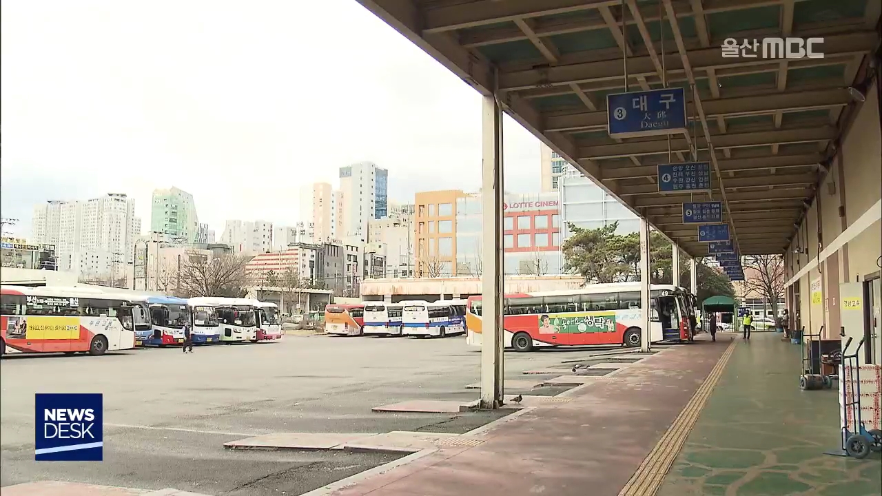 코로나19 여파로 울산지역에서 동대구로 가는 시외버스 운행이 더 감축됐습니다. 울산시외버스터미널은 동대구행 시외버스가 평소 하루에 30편 운행했으나 현재는 하루 2편만 운행되고 있습니다. 고속버스터미널 역시 하루 33편에서 8편으로 줄였다가 또 5편 정도로 줄인다는 계획입니다.//