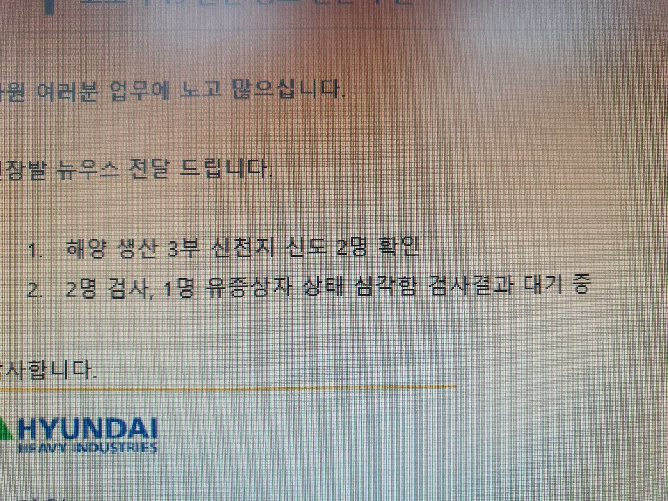 문제가 된 공문현대중공업 해양 생산 3부에 신천지 신도 2명이 가운데 1명 유증상자 있다는 내용팩트 체크회사 : 현대중공업 해양사업부에서 코로나19 증세를 보이는 신천지 신도가 있다는 회사 공문 형태의 캡처 사진이 SNS에 나돌자 회사측은 이러한 문건을 배포한 적이 없다고 밝혔습니다. 현대중공업은 이 문건이 유...