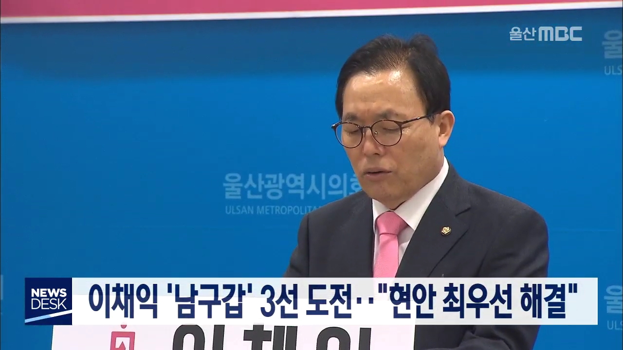 미래통합당 이채익 의원이 오늘(2/24) 남구갑 출마를 선언했습니다. 이 의원은 옥동 군부대 이전과 도시재생 뉴딜사업, 원자력 관련 산업 등 지역 현안을 최우선 해결하는 3선 의원이 돼 울산 발전을 견인하겠다고 포부를 밝혔습니다. 통합당은 이채익·김두겸·최건 등 예비후보 3명에 대한 공천 심사를 진행했으며, 빠르면 ...