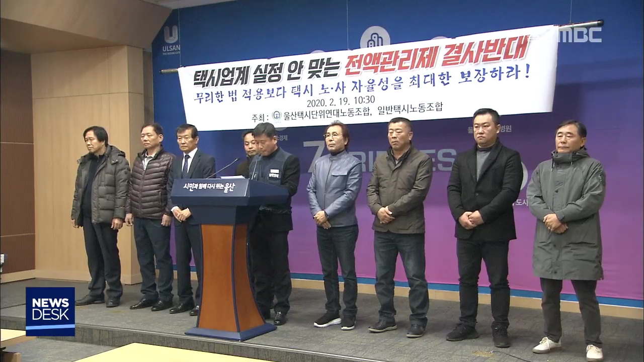울산택시단위연대 노조는 오늘(2/19) 시청에서 기자회견을 열고, 올해 개정된 여객법에 따른 운송수입금 전액관리제를 반대한다고 밝혔습니다. 노조는 올해부터 1일 기준 사납금이 없어지고 운송수입금 전액을 납부한 뒤 월급을 받게 되면서 오히려 전체 급여가 30% 줄어들게 됐다고 주장했습니다.//
