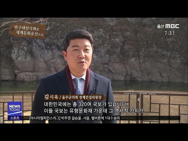 30.김시욱 울주군의회 경제건설위원장대한민국에는 총 320여 국보가 있습니다. 이들 국보는 유형문화재 가운데 그 역사적 가치가 특별히 크고 중요하다고 판단되는 대상들을 국가에서 지정한 것인데요. 반구대 암각화는 국보중 유일하게 신석기시대에 만들어진 것으로 추정되고 있습니다. 대한민국에서 가장 오래된 문화유...