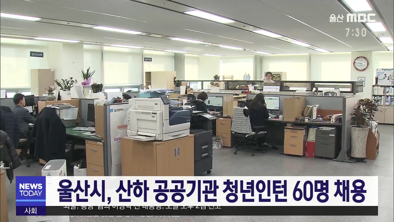 울산시는 시비 등 6억3천만 원을 투입해 공공기관 청년인턴 채용사업을 시행한다고 밝혔습니다. 공공기관 일자리 체험인 이 사업에 참여하는 기관은 울산시설공단과 울산발전연구원, 울산도시공사 등 울산시 산하기관 9곳입니다. 신청 자격은 울산에 거주지를 둔 만 15살 이상 34살 이하 미취업 청년으로 모두 60명을 모집...