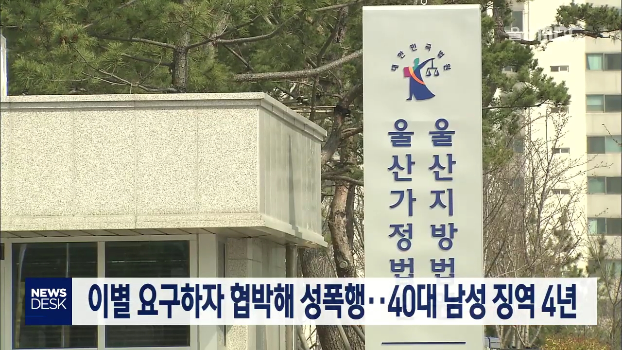 울산지방법원 제11형사부는 강간과 협박, 성폭력처벌법 위반 혐의로 기소된 41살 A씨에게 징역 4년을 선고했습니다. A씨는 연인 관계였던 여성이 지난해 자신과 헤어져 달라고 요구하자 몰래 찍어둔 신체 사진을 유포할 것처럼 협박한 뒤 성폭행하는 등 피해 여성을 3차례 성폭행하고 협박한 혐의 등으로 기소됐습니다.//