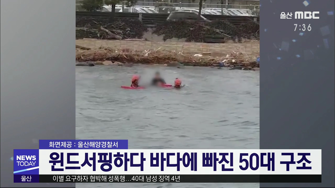 어제(2/16) 오후 3시 35분쯤 북구 염포부두 인근 해상에서 윈드서핑을 하던 53살 이모 씨가 바다에 빠져 신고를 받고 출동한 해경에 구조됐습니다. 울산해경은 강풍으로 보드가 전복되면서 이씨가 바다에 빠진 것으로 보고 자세한 사고 경위를 조사하고 있습니다. //