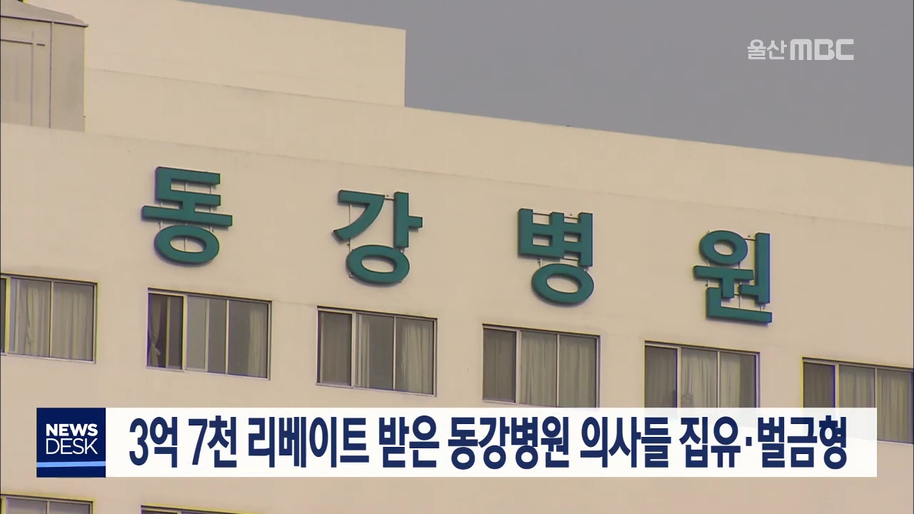 동강병원 성형외과 의사들이 제약회사와 의료기기업체로부터 3억 7천만 원이 넘는 리베이트를 받은 혐의로 유죄 판결을 받았습니다. 울산지방법원 제11형사부는 배임수재와 의료법위반 혐의로 기소된 동강병원 성형외과 의사 김모 씨에게 징역 1년에 집행유예 2년을, 성형외과 과장 양모 씨 등 의사 4명에게 각각 벌금 500...