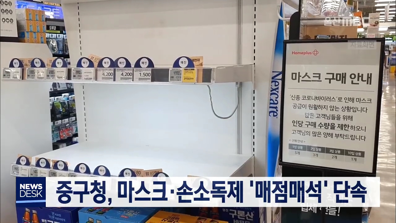 코로나 19로 인해 마스크와 손소독제 수요가 급증하면서 중구청이 가격안정 점검에 나섭니다. 중구청은 지역 내 300㎡ 이상 대형마트 19곳을 대상으로 '의약 외품 불공정 거래행위 합동점검'을 오는 18일까지 실시한다고 밝혔습니다. 중구청은 마스크와 손소독제 매점매석이 적발될 경우 식약처에 보고해 경찰 수사를 의뢰...