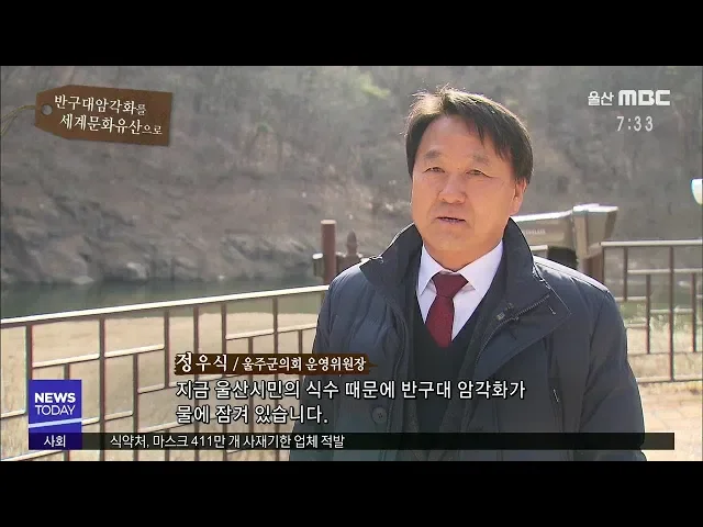 정우식 울주군의회 운영위원장지금 울산시민의 식수 때문에 반구대 암각화가 물에 잠겨 있습니다. 식수문제는 울산시민들에게만 떠넘길 것이 아니라 국가적인 차원에서 울산 시민들에게 깨끗한 물을 공급할 수 있는 방안을 모색을 먼저 해야 한다고 생각합니다. 그래서 물 문제는 울산시민들도 맑은 물을 먹을 수 있는 권리...