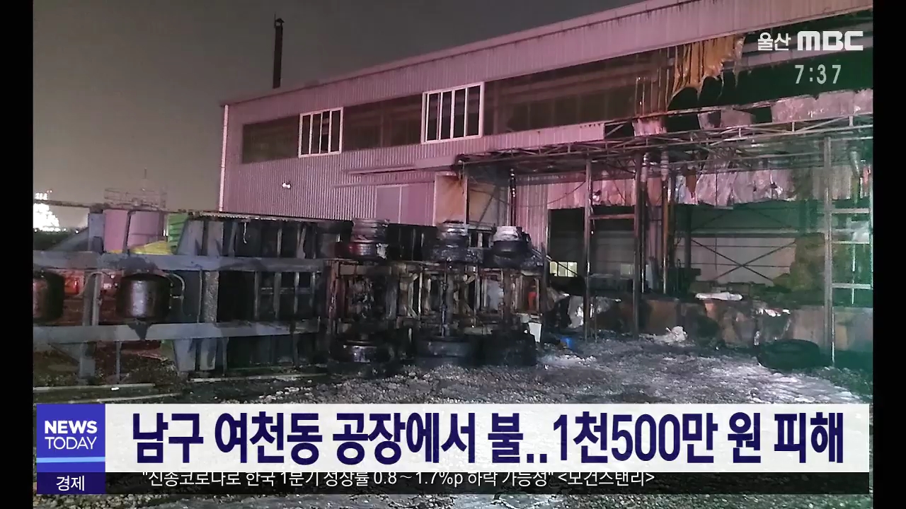 어제(2/11) 밤 8시 50분쯤 울산시 남구 여천동의 한 공장에서 불이 나 고체 상태의 기름 20톤이 저장돼 있던 컨테이너 1개와 빈 컨테이너 일부 등을 태워 소방서 추산 1천 500만원의 재산 피해를 내고 40분만에 꺼졌습니다. 경찰과 소방당국은 직원들이 모두 퇴근한 공장에서 불이 시작됐다는 목격자의 말 등을 토대로 정확...