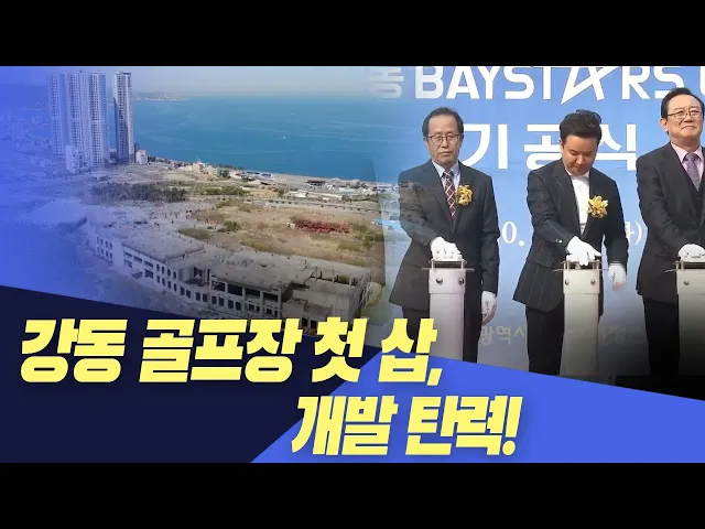 ◀ANC▶북구 강동의 랜드마크가 될 18홀 골프장이 첫 삽을 떴습니다. 사업을 추진한지 10여년 만에 가시적인 결실을 거둔 건데요. 지지부지한 강동권 개발의 물꼬를 트는 역할을 할 것으로 보입니다.유영재 기자 ◀END▶ ◀VCR▶전국 최대 규모의 복합 해양테마관광도시가 건설 중인 북구 강동지역. 이 일대 18홀 규모...