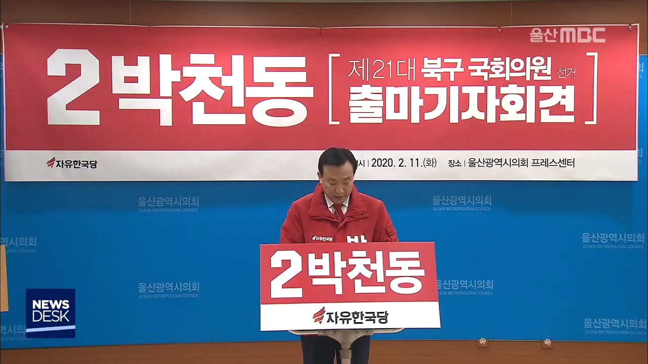 박천동 전 북구청장은 오늘(2/11)울산시의회 프레스센터에서 기자회견을 열고4.15 총선에 자유한국당 소속으로 북구 출마를선언했습니다.박 전 청장은 경제학 지식과 행정 경험을 살려북구의 정주여건을 높이고,울산의 재도약을 위해 일하는 국회의원이되겠다고 포부를 밝혔습니다.//