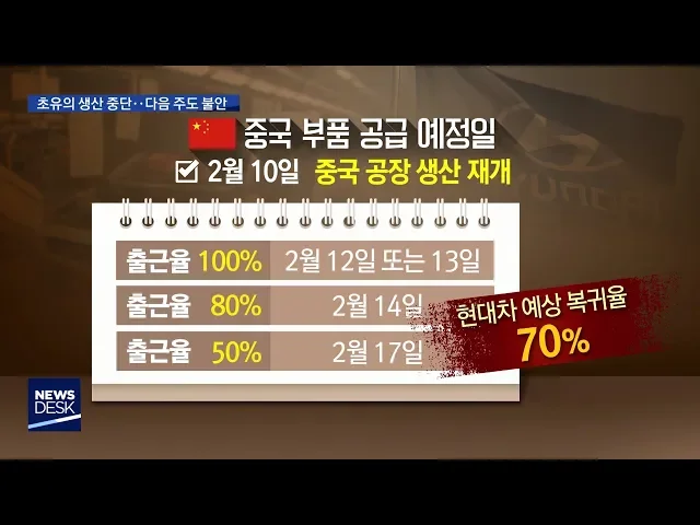 ◀ANC▶현대자동차 울산공장이 오늘부터 전면 생산중단에 들어갑니다.다음 주 수요일 생산 재개가 목표인데 이마저도쉬워 보이지 않습니다.자동차 업계 전체가 중국만 바라보며 전전긍긍하고 있습니다.이돈욱 기자입니다. ◀END▶ ◀VCR▶평소 부품 운송 차량이 쉼 없이 오가는 현대차울산공장 입구입니다.직원들만 입...