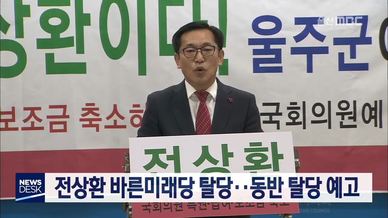 울주군 총선에 출마한 바른미래당 전상환 예비후보는 오늘(2/6) 기자회견을 열고 진정한 중도보수 세력에 참여하기 위해 탈당을 결심했다며, 안철수 신당 행을 예고했습니다. 전 예비후보는 고원도 남구 을 예비후보와 손삼호 전 동구지역위원장을 비롯해 울주군 당원 200여 명이 동반 탈당할 예정이라고 밝혔습니다.//