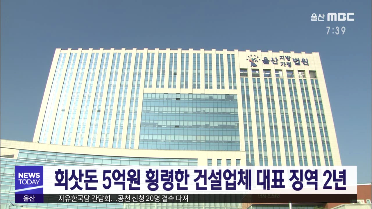 울산지법 형사11부 박주영 부장판사는 건설업체 대표이사로 재직하면서 회삿돈 5억여원을 횡령한 혐의로 재판에 넘겨진 58살 A씨에게 징역 2년을 선고했습니다. A씨는 지난 2015년 회사 자금 5억1천600만 원을 가로챈 혐의로 기소됐으며 횡령한 돈은 3년 넘게 도피 생활을 하며 생활비와 빚을 갚는데 쓴 것으로 드러났습니...