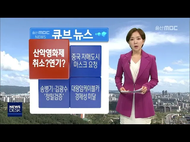 울주군은 신종 코로나 예방을 위해 4월 개최 예정인 제5회 울주세계산악영화제의 취소 또는 연기를 검토하고 있습니다.이선호 군수는 기자간담회에서 국내는 물론해외 인사들이 많이 찾는 행사를 4월에 갖는것은 신종 코로나 확산 우려 때문에 현실적으로 힘들 것으로 본다며,가을로 연기할 것인지, 아니면 올해 영화제를아...