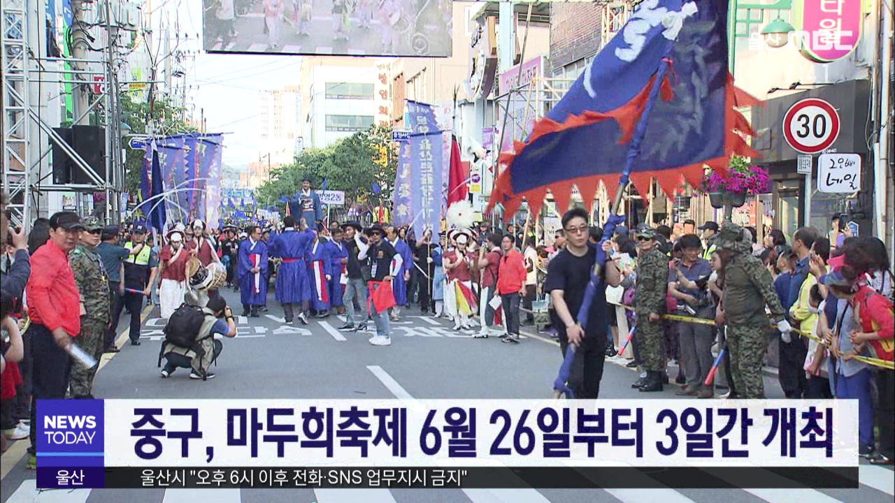 중구가 울산 마두희 축제를 음력으로 단오 다음날인 6월 26일부터 28일까지 3일간 개최합니다. 마두희는 1천700년대 초부터 단오날마다 병영과 울산부 사람들이 동군과 서군으로 나눠 줄당기기를 겨루는 행사로 일제강점기 중단됐다가 2014년 복원돼 매년 개최하고 있습니다.///
