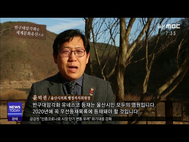 윤덕권 울산시의회 행정자치위원장반구대암각화 유네스코 등재는 울산시민 모두의 염원입니다. 2020년에 꼭 우선등재목록에 등재돼야 할 것입니다. 여름 장마, 태풍을 피할 수 있도록 여수로의 수문 설치에 적극적으로 화답하고 문화재청과 함께 이 세계적인 보물을 반구대암각화를 지키는 그런 강력한 의지를 보여줄 필요...