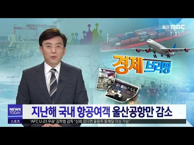 ◀ANC▶지난해 우리나라 항공여객이 사상 최대치를기록했는데 울산공항 이용객만 감소했습니다.울산 아파트값 상승세가 지속되는 가운데전세가격도 급등하고 있습니다.경제브리핑, 이돈욱 기자입니다. ◀END▶ ◀VCR▶지난해 일본노선 감소 영향으로 국내선 항공여객이 9천만 명을 넘어서며 역대 최고치를 경신했지만 ...