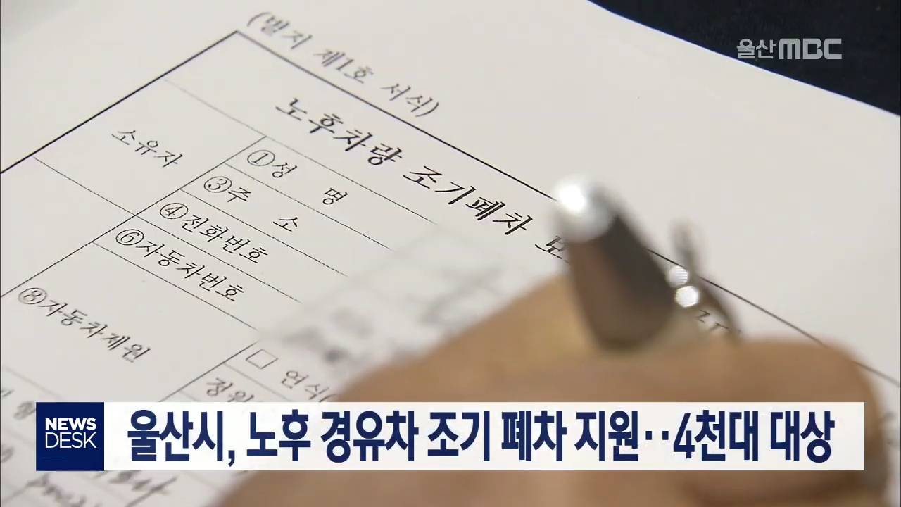 울산시가 올해도 노후경유차 조기 폐차 지원 사업이 추진합니다. 지원 대상은 배출가스 5등급 경유차나 2005년 이전 배출 허용 기준을 적용한 건설기계 3종 등 모두 4천대 입니다. 시는 다음 달 19일부터 21일까지 사흘간 현장 접수를 받고, 민원인 불편 해소를 위해 다음달 3일부터 21일까지 우편 신청도 받는다고 밝혔습...