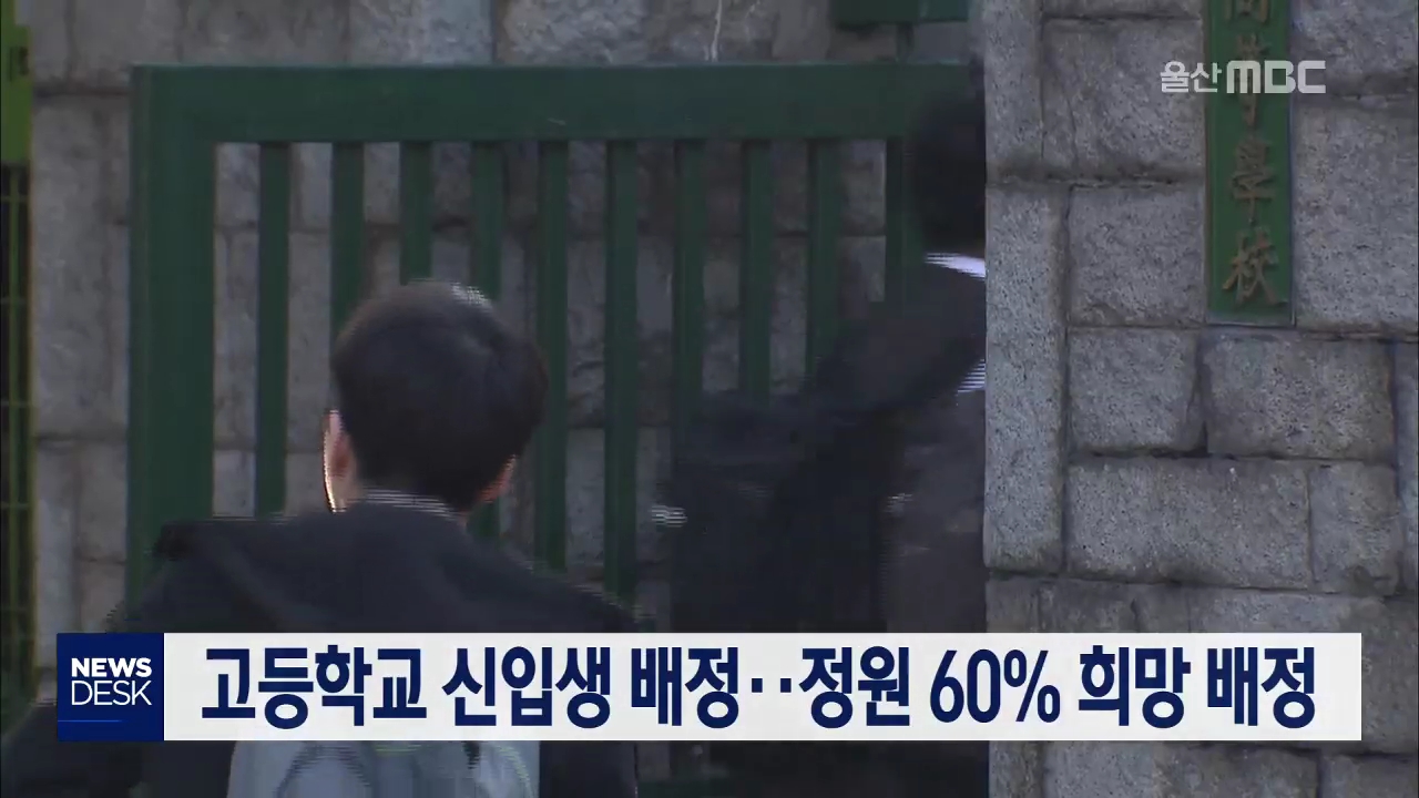울산시교육청이 올해 일반계 고등학교 41개교에 신입생 7천884명의 배정을 마쳤습니다. 교육청은 1단계 전체학군과 2단계 거주학군 지원자 추첨으로 학교별 정원의 60%를 희망 배정했으며, 40%는 거주학군과 인접학군에 평준화 배정했다고 밝혔습니다. 고등학교 신입생은 오는 31일 예비소집에 참석하고 다음달 7일까지 배...