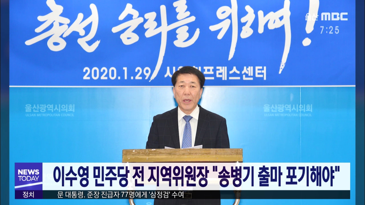 더불어민주당 이수영 전 동구지역위원장은 오늘(1/29) 기자회견을 열고, 송병기 전 경제부시장은 스스로 총선 출마를 포기해야 한다고 주장했습니다. 이 전 위원장은 최근 참고인 신분으로 서울중앙지검에 출석해, 송 전 부시장의 업무수첩 일부를 눈으로 확인했다며 민주당 소속으로 절대 해서는 안 될 일들이 적혀 있었다...