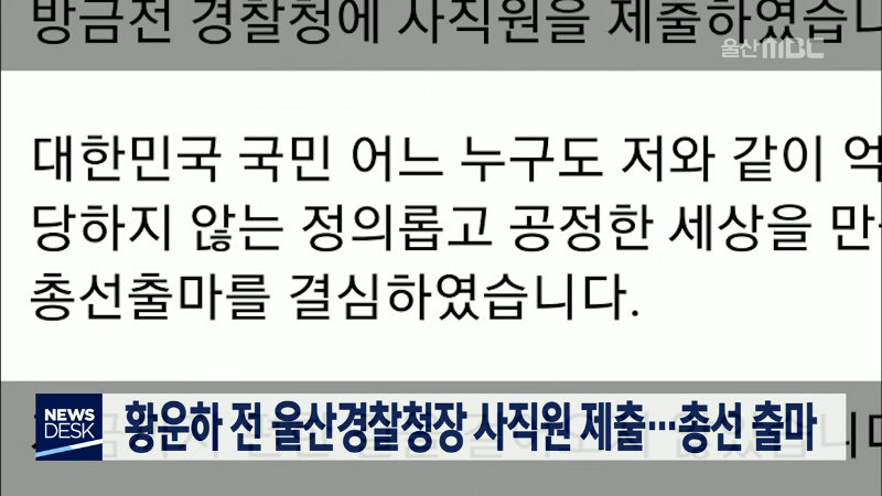 황운하 경찰인재개발원장이 총선 출마를 위해 사직원을 제출했습니다. 황 원장은 오늘(1/15) 자신의 페이스북에 정의롭고 공정한 세상을 만들기 위해 총선 출마를 결심했다고 밝혔습니다. 황 원장은 울산지방경찰청 재직 시절 김기현 전 시장 측근비리를 수사한 것은 일반적인 지역 토착 비리 수사로 청와대 하명에 의해 이...