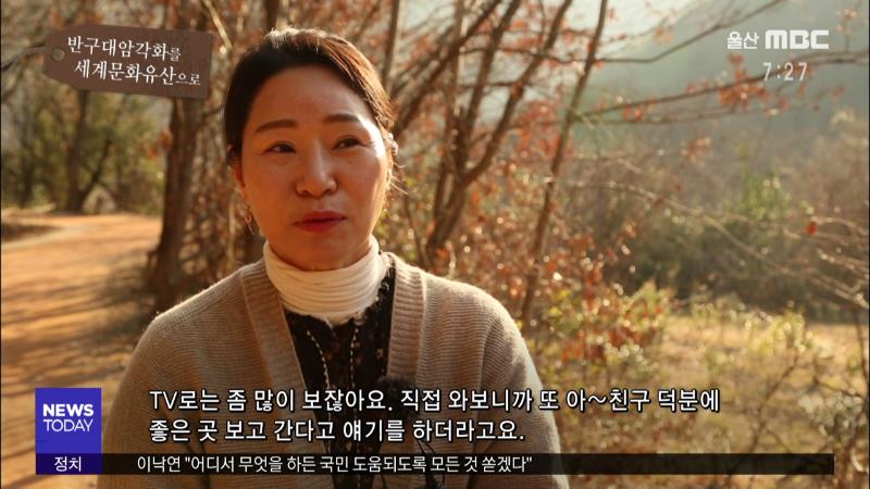 김미령 /울주군 언양읍 걷기도 참 좋고 또 문화적으로 세계적으로도 알아주는 암각화이고 하니까 소개하기도 괜찮고. 누가 언양에 오면 항상 여기 데려와요. 어 이런 것도 있었냐고 좋다고 얘기를 해요. TV로는 좀 많이 보잖아요. 직접 와보니까 또 아~친구 덕분에 좋은 곳 보고 간다고 이야기를 하더라고요 그래서 아 한 ...