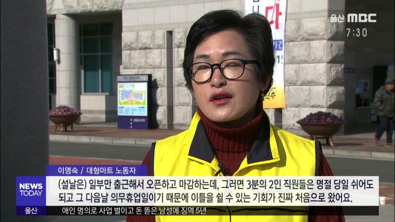 ◀ANC▶ 이번 설날 다음날은 일요일로 대형마트의 의무 휴업일입니다. 그런데 진주시가 의무휴업일을 일요일에서 설날인 토요일로 바꾸려고 하자 노동자들은 "꼼수'라며 반발하고 나섰습니다. 경남 이재경 기자.. ◀END▶ ◀VCR▶ 마트 노동자들에게는 노동 강도가 높은 명절이 마냥 반갑지만은 않습니다. (달력c/g) 그...