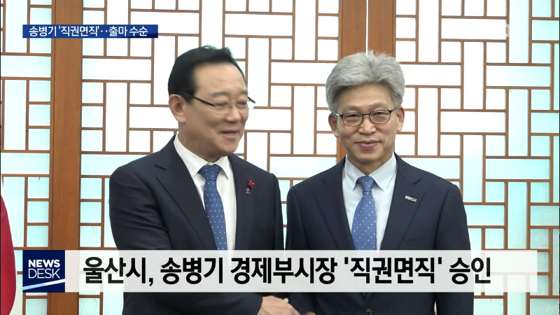 ◀ANC▶ 송병기 경제부시장이 총선 출마를 위한 공직자 마감시한을 이틀 앞둔 오늘(1/14) 직권면직됐습니다. 4.15 총선 출마를 위한 수순으로 보이는데 송 부시장은 긍정도 부정도 하지 않은 채 동료들과 작별 인사를 나눴습니다. 최지호 기자. ◀END▶ ◀VCR▶ 송병기 부시장이 직권면직됐습니다. 울산시는 비공개 인사...